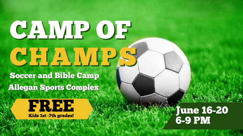 We are hosting a FREE, 5 day-camp designed to help kids build lasting friendships and grow in character qualities like teamwork, discipline, and servant-heartedness. At camp, kids will learn the basics of soccer from real coaches and soccer players, enjoy crazy games, and get personal encouragement from supportive leaders. They will also learn about God's Word and be shown how to apply it to their lives. Because our mission at ABC Youth Ministries is to take kids from lost to leading for the glory of God, Camp of Champs is totally free. Camp will run each day from 6-9pm at the Allegan Sports Complex 1451 29th St, Allegan, MI 49010. We are excited to get to know your kids and invest in them this summer!
